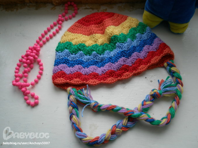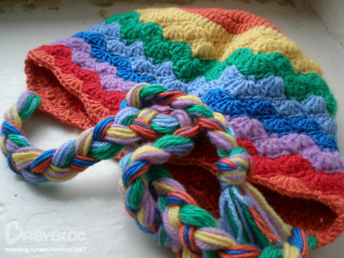 Хоть на улице и не совсем весна, но уже хочется чтобы природа заиграла зеленью, и вот такая радужная шапочка у меня родилась в первый день весны. К сожалению доча не дает на себе ее сфоткать, снимает быстро))) Муж сказал что она в ней напоминает ему хиппи)))