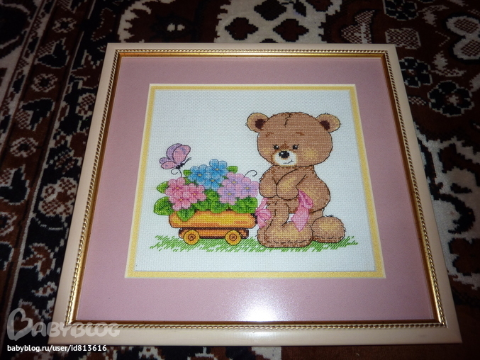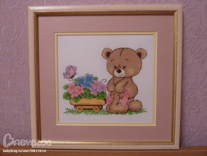 Вышивался мишка в игре Авантюра прошлым летом, а оформился только сейчас) Оформляла в багетке рядом с домом и это был первый опыт работы с багеткой. Итак, деревяная рама, двойное паспарту, антибликовое стекло. Натягивала сама. Дома же, когда начала прикладывать к стенам куда бы повесить, то с восторгом обнаружила что цвет паспарту перекликается с цветом обоев, это удивительное совпадение, потому что оформление помогала подбирать сотрудница багетки. В мишке же смешалось все что могло ( это я про нитки): там и ДМС и Гамма и ПНК). Теперь у меня идея вышить ещё пару мишек из этой серии, такие уж они очаровательные.