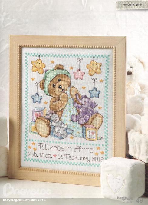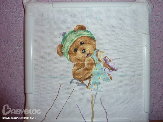 А это то что вышиваю сейчас. Тоже мишка, будущая метрика для дочки, из "Вышиваю крестиком" 06/2012.