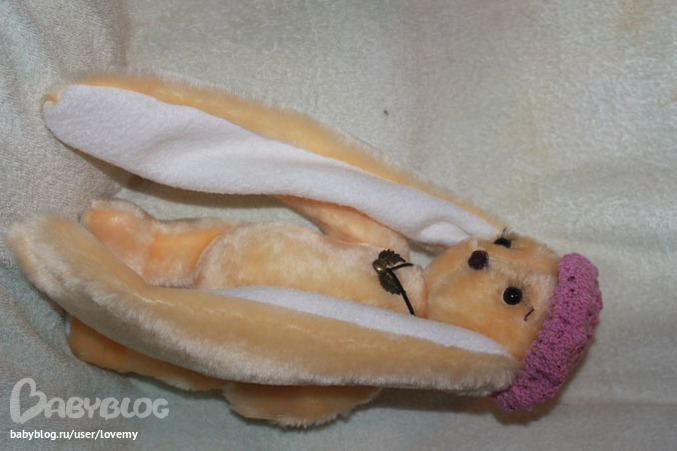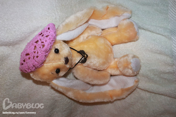 зайка сшита из искуственного меха, в попе в ручках и ножках гранулят, на голове вязанный ажурный берет(сьемный) ,на шее подвеска сердечко на замшевом шнурочке глазки пластиковые на глазках реснички