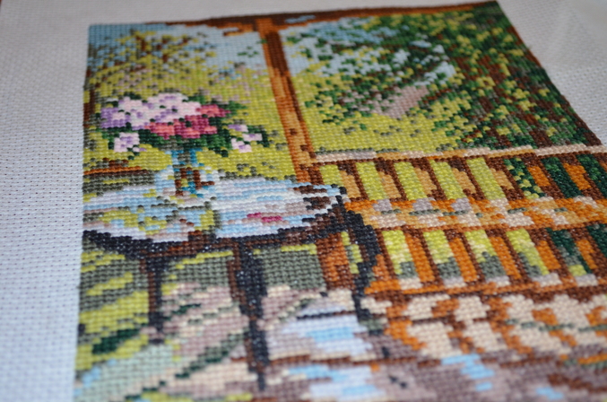 Сюжет незатейливый, но по своей манере чем-то напомнил мне работы любимых мной импрессионистов. Шилась легко и с удовольствием. Нитки шерстяные, поэтому я и называю эту работу "тёплой". Чувствуется лето, свежесть после дождя, теплое солнце и влажный воздух с ароматом садовых цветов...