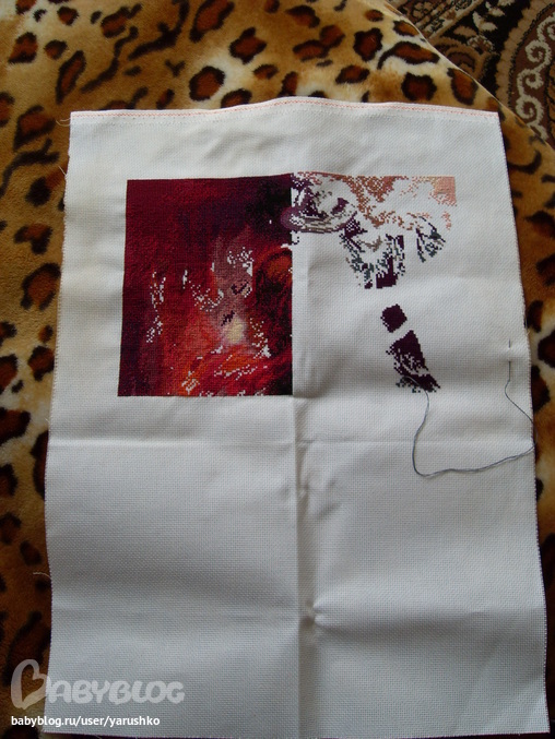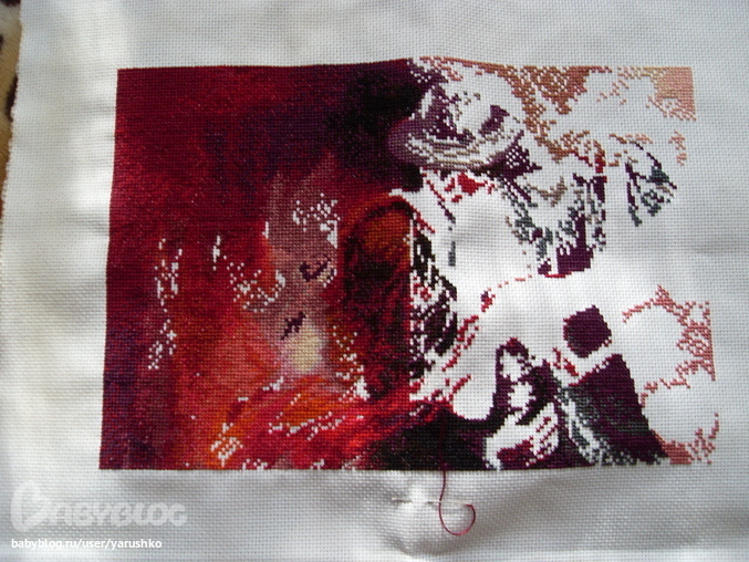 Уже пошел второй год, как я мучаю эту работу. У меня канва уже начала желтень. Вобщем, ПИНАЙТЕ, ПИНАЙТЕ, и ещё раз ПИНАЙТЕ меня! Иначе я вышивку не закончу)