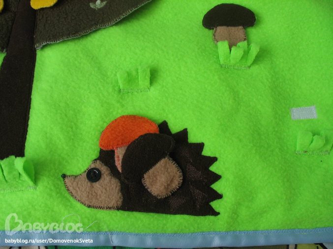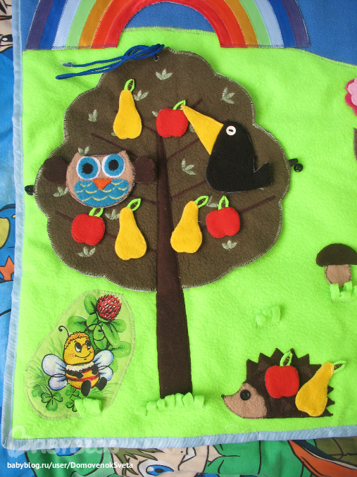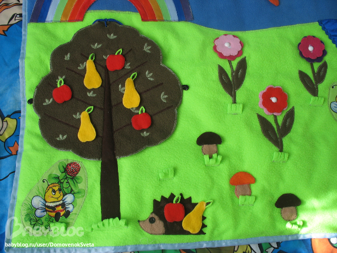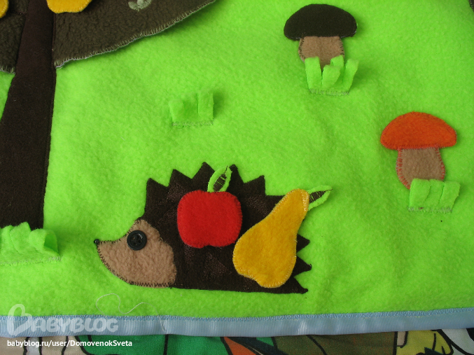 Груши, яблоки и грибы на липучке. Фрукты можно оставить на дереве, а можно и к ежику прилепить. То же и грибами ))) Цветочки на пуговке. Сначало запланировал по 4 яруса, но цветики получили толстоваты, т.к. все шила из флиса. Маленькие цветочки раскидала по коврику, и про запас, чтобы можно было менять крупные на маленькие.