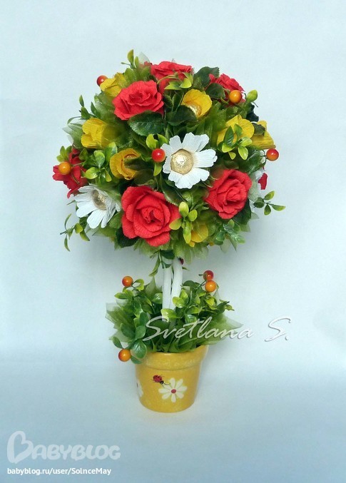 очень все красиво!!!розочки великлепны!деревце оченькрасивое, яркое, сочное!ручной букет получился нежным!!!работы аккуратные!молодец!