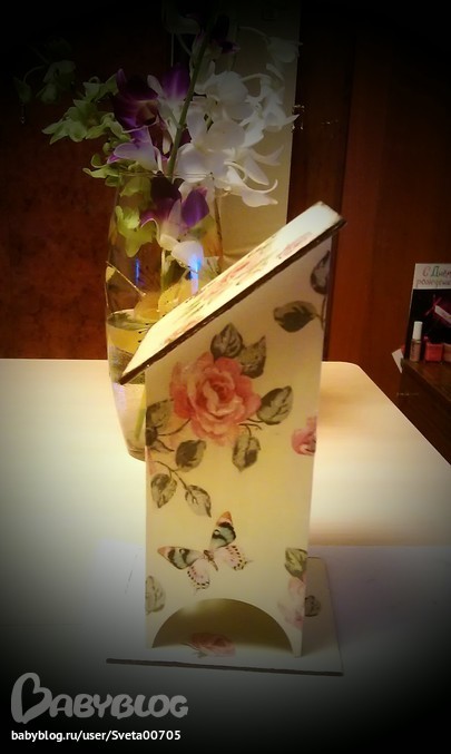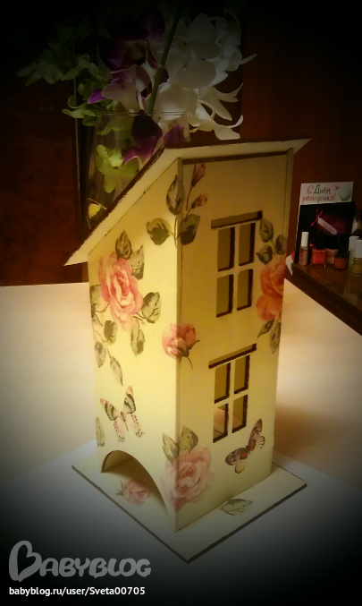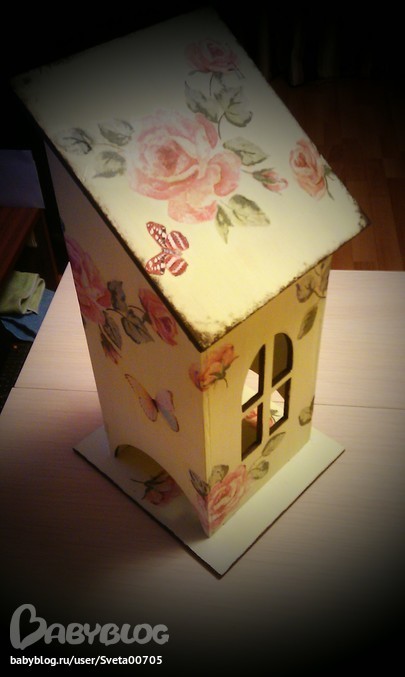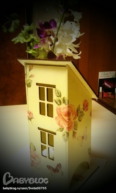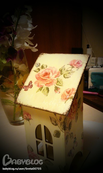 А я хочу, что бы крыша у него снималась:))))), а то пакетики ложиться не удобно:(. И низ, у меня кракелюр одношаговый, тоже прочитала, что нужно отдельно декорировать, ну, думаю, первый мой дом комом, последующие лучше пойдут)))