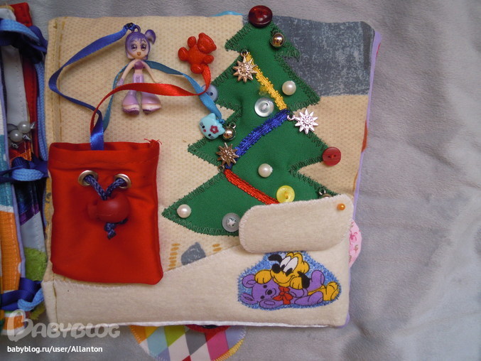 Мешочек на стопоре, внутри на ленточках подарки: кукла, мишка и котенок. На елке просто всякое нашито. Под елкой сугроб, в сугробе Плуто.