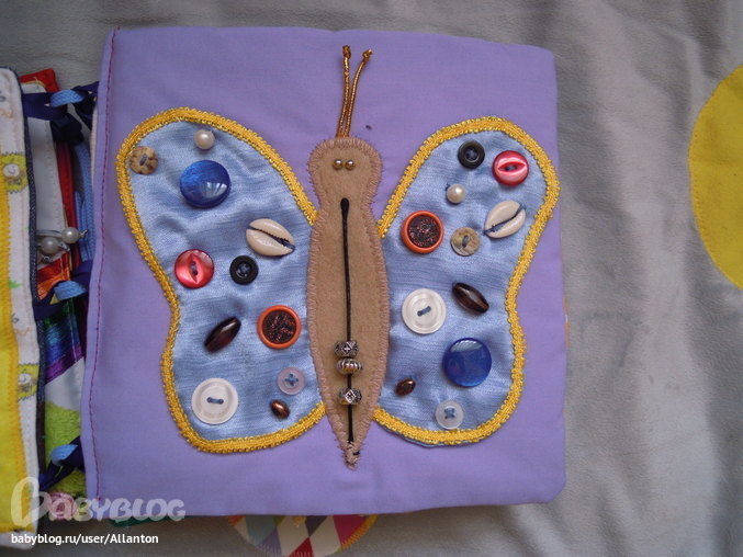 Бабочка. Усики подвижны, на теле шнурок с бусинами, которые можно двигать. На крыльях пуговицы- искать пару.