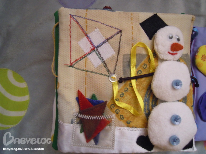 Воздушный змей на липучке, каждый треугольник лепится на свое место по цвету контура, все части убираются в прозрачный кармашек. Снеговик мягкий, руки перетягиваются.