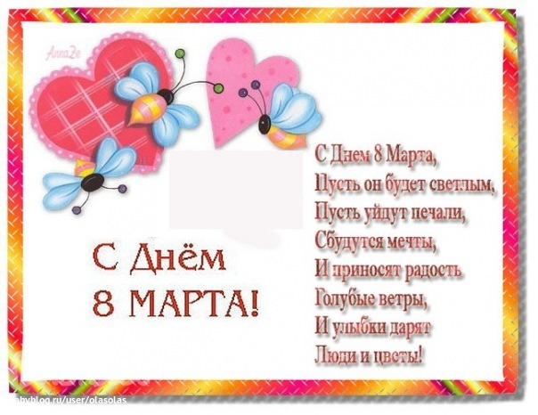 Всех девочек, девушек, женщин, внучек, дочек, мам, бабушек и прабабушек:), племянниц, тёть, свекровей и тёщ от души поздравляю с прекрасным весенним праздником 8 МАРТА!!! Счастья вам, любви, удачи, вдохновения, достатка, семейного благополучия и море, океан цветов!!!!!!! Я вас люблю:)