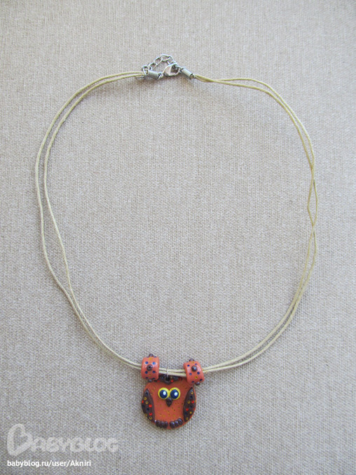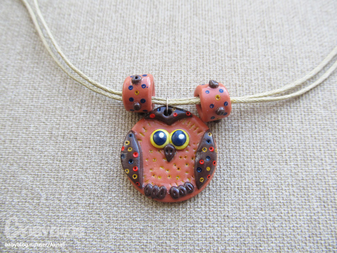 В принципе можно сказать что это мой первый опыт и бла- бла- бла. А вообще то, вот захотелось мне прям чего то прикольного, ходила ходила я по магазинчикам бижутерии так и не нашла что хотела (нужна была весёлая висюлька что бы под кофточку подошла) и слепила я себе сову которую уже одевала