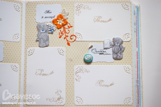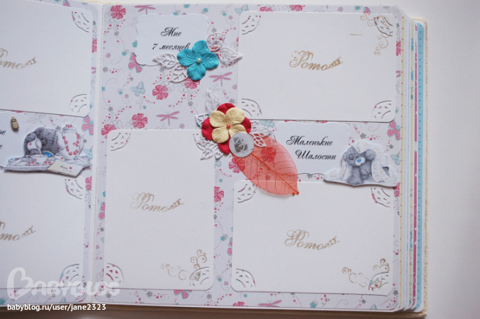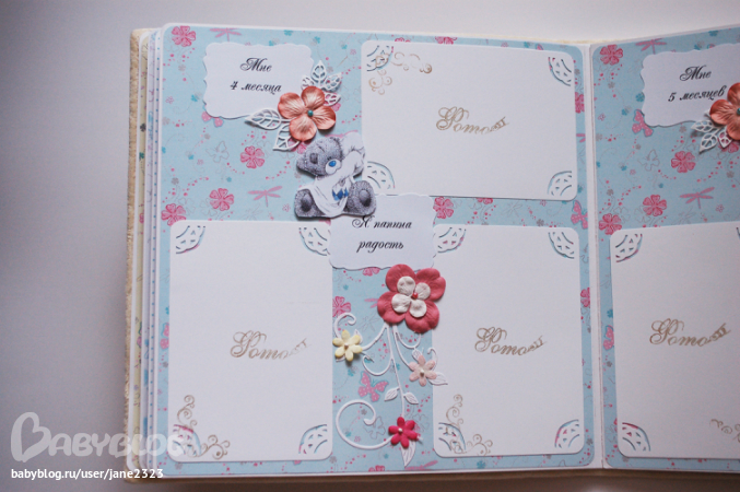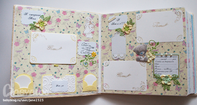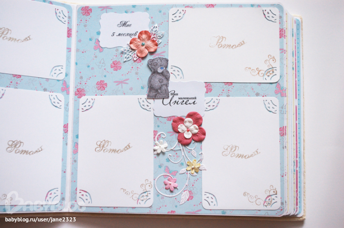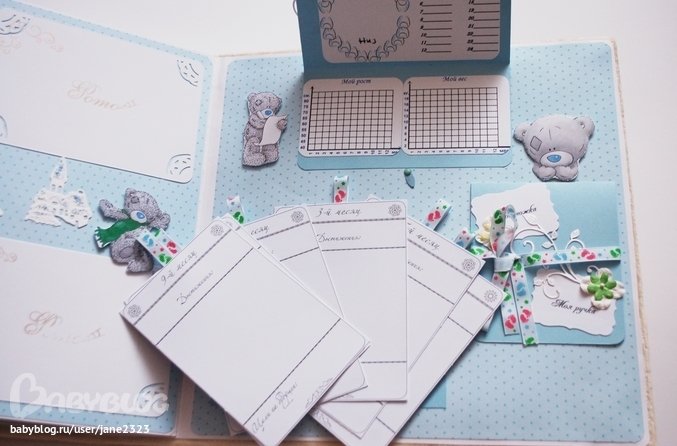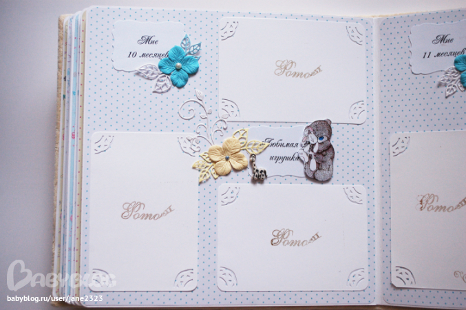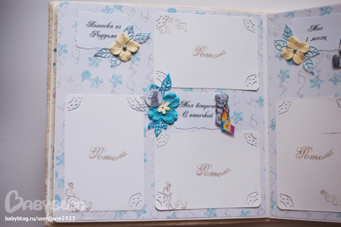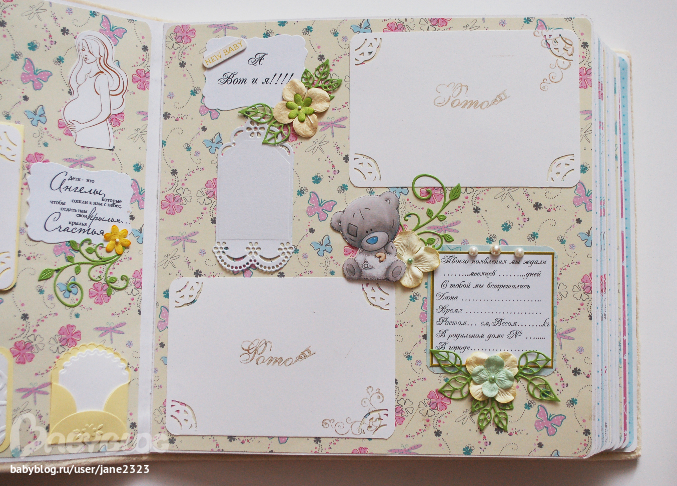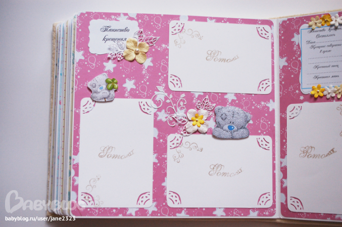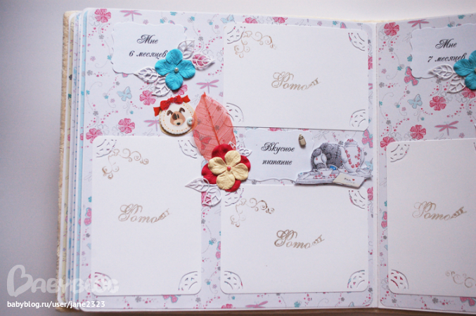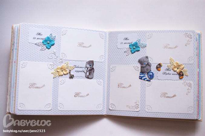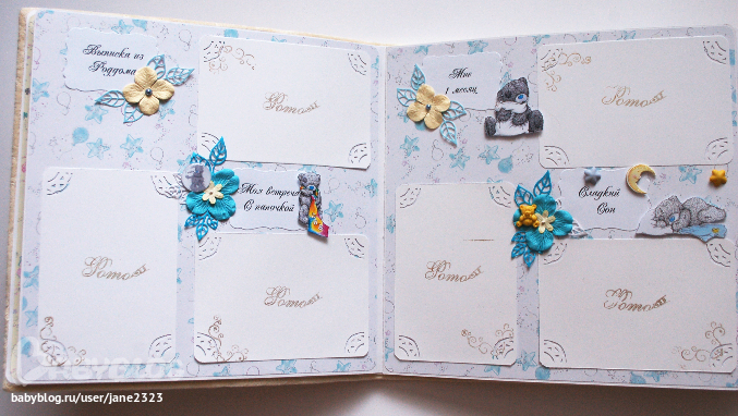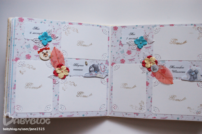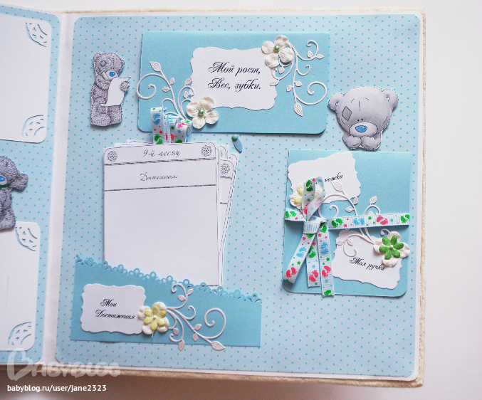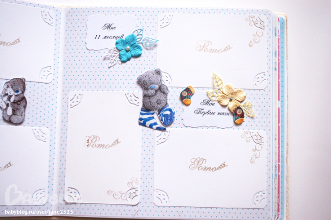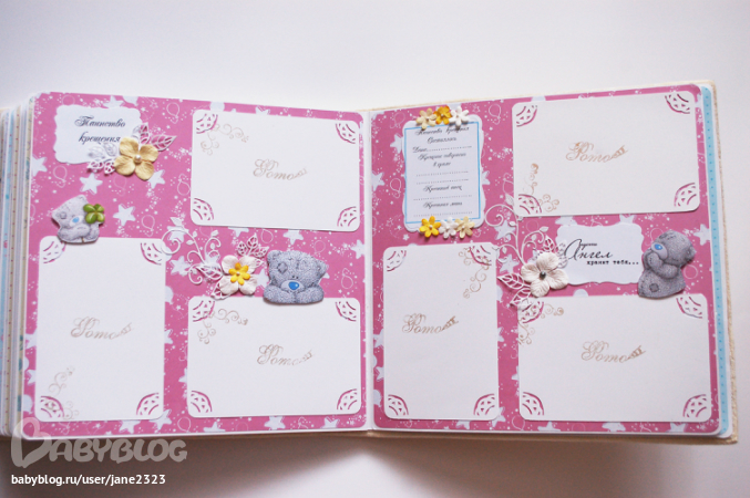 разделы: «В ожидании чуда», «А вот и я»," Выписка из роддома", Фото по месяцам с 1 по 12 мес," первый день рождения", «Таинство крещения»,«Мой первый новый год» Места для записи о весе, росте, зубках малыша, места для ладошки и ножки, достижения малыша по месяцам"
