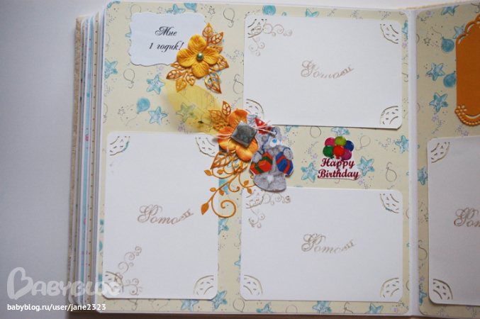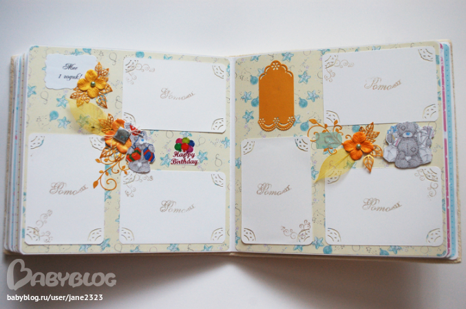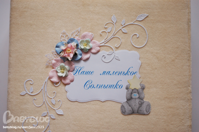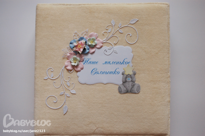 Так хочется уже побольше тепла и солнышка.Вот так и назвала этот альбом "Солнышко" Сделан он на заказ. Просили, чтоб присутсвовали все цвета и розовые и голубые.Размером 30х30, 10 листов, 22 страницы (вместе с титул.), обложка велюр, мягкая, вмещает 64 фото размером 10х15. Герой альбомчика, всеми любимый мишка тедди.В альбом входит,