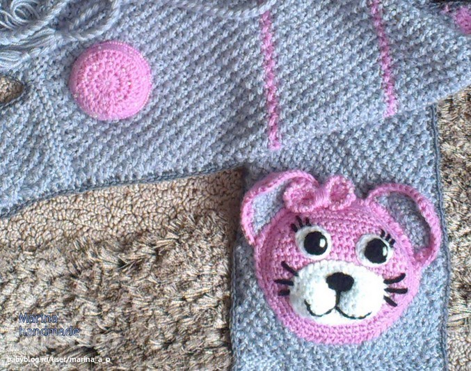 Шарфик связан спицами мелкой жемчужной вязкой. Мордочка с хвостиком поближе. Бантик и хвостик обшиты розовым и белым бисером.
