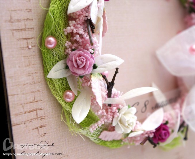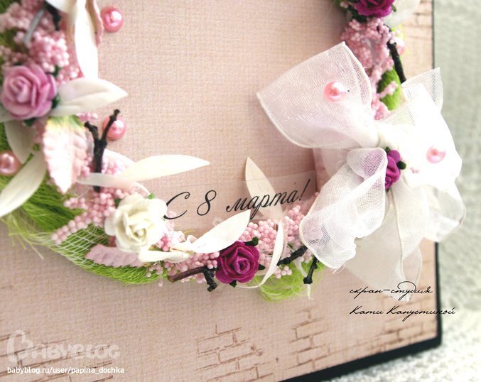 использовала самодельную заготовку из картона, обклеенную бумагой шоколадного цвета.венок составлен из веточек Scrapberry's, использована белая лента с листьями, тайские розочки и листья, натуральные веточки, собранные во время прогулки с дочей :) подложка под венок - обыкновенный медицинский бинт, окрашенный спреем Tattered Angels (оттенок "киви"), плюс полужемчуг. По краям использовала штамп "Кирпичная стена" от Kaisercraft, чернила "Vintage Photo" от Ranger. Надпись "С 8 марта" - распечатка на лазерном принтере на плёнке для проекторов. Белый бант сбоку - раздербаненая мной лично детская резиночка для волос.Эту открытку я подарила няне моей дочки, которая меня очень часто выручает в разных непредвиденных ситуациях.