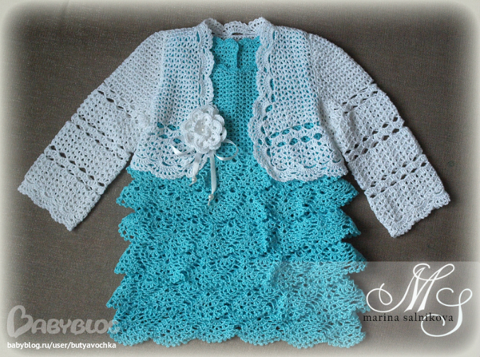 Размер на 1 годик, связано из пехорки ажурной (льдинка), расход на платье 120гр, болеро90гр.