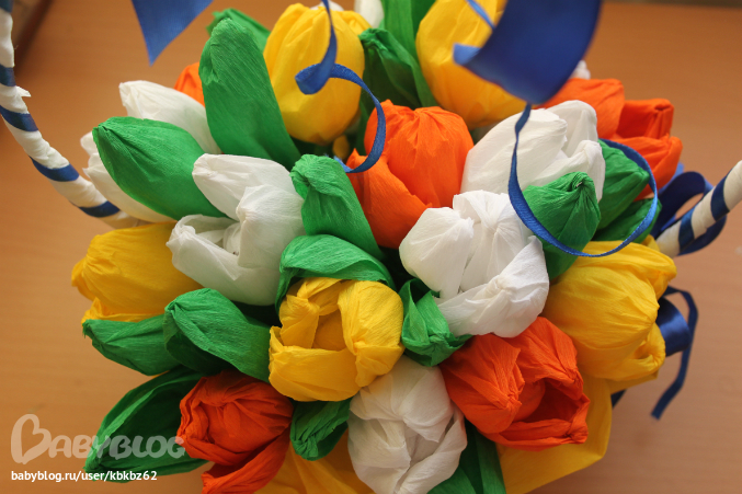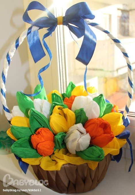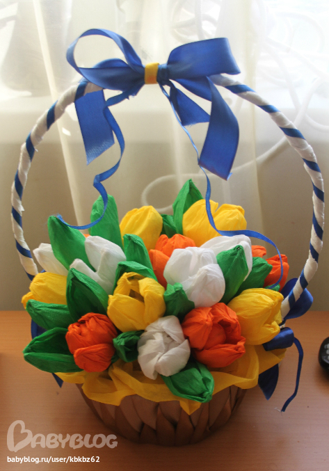Букет яркий, корзинка необычная , вы ее тканью оплетали ? ЕдИнственное , что не понравилось - обмотана оформлена ручка корзины. Такое впечатление , что она обмотана бинтиком ( извините конечно). Но на ручку в первую очередь обращают внимание , поэтому она должна быть выполнена безукоризненно ). И ленту шелковую я бы взяла одного цвета с любым цвиском из корзины , а то синий тут , конечно, яркой смотрится , но мне кацца , перебор со цветами ))))))