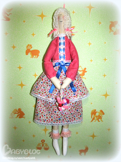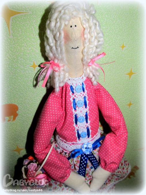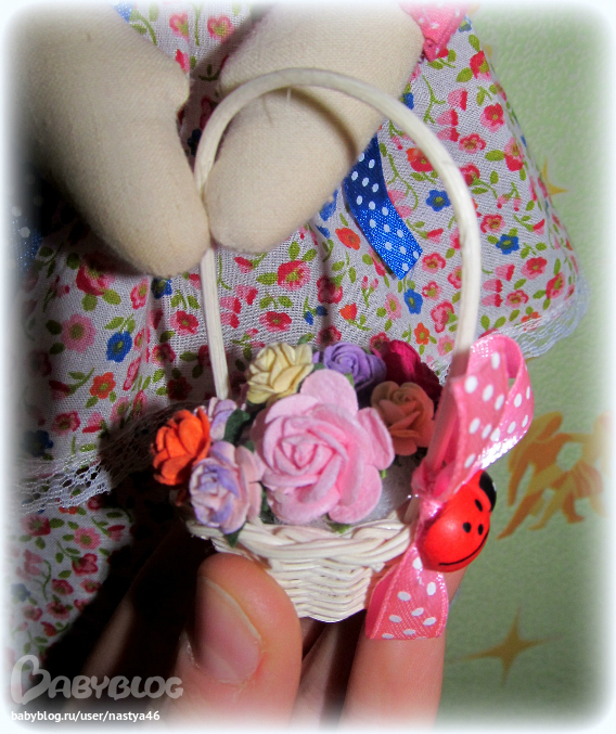 Высокая таки девушка получилась — 50 см росту)С такой вот милой корзиной цветов в ручках. Поэтому и прозвалась она у меня Девочкой цветочницей