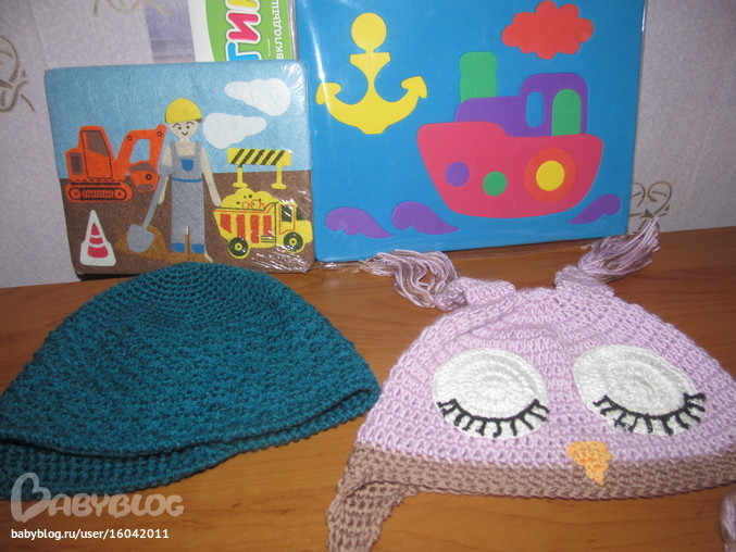 для сынульки 2 шапульки, панно из фетра, и мягинькая развивашка