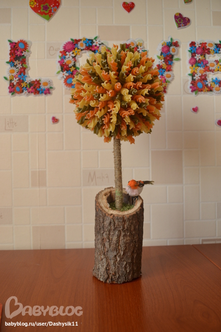 Спасибо! Теперь с деревом можете поэксперементировать. Вообще изначально я сделала его из белых макарон и покрасила зеленой краской, но макарохи отвалились, т.к. шарик я по глупости тоже краской покрасила)