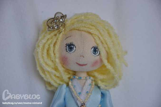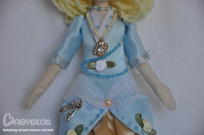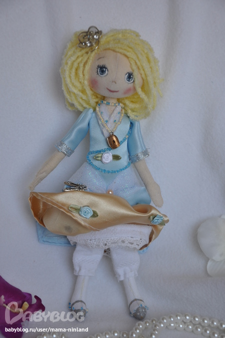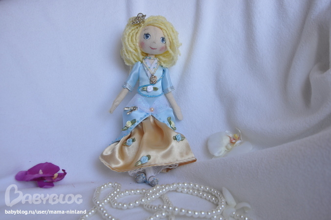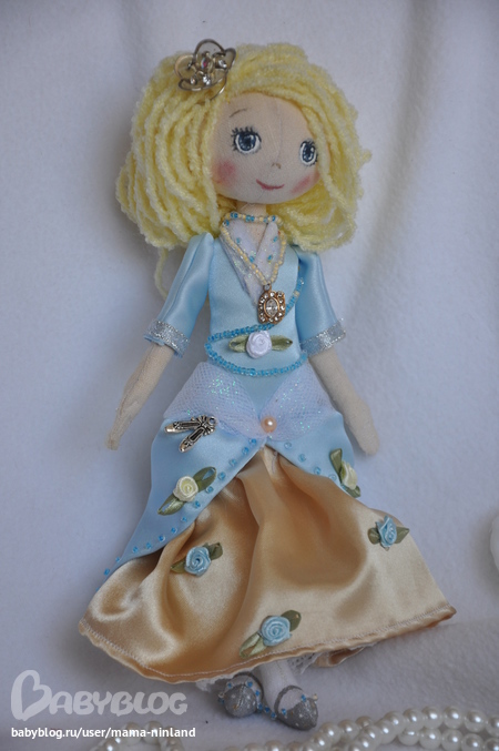 Текстильная кукла ручной работы в стиле тыквоголовка "Золушка на балу". Рост 25 см. Создана по мотивам чудесного советского мультфильма "Золушка". Ножки, ручки сгинаются в коленах и локтях, кукла сидит с опорой. На куколке золотисто-голубое атласное платье, украшенное бисером, блестящим фатином, бусинами, атласными розочками. Под платьем - хлопковая нижняя юбка, отделанная кружевом и белоснежные панталончики. Одежда не снимается.