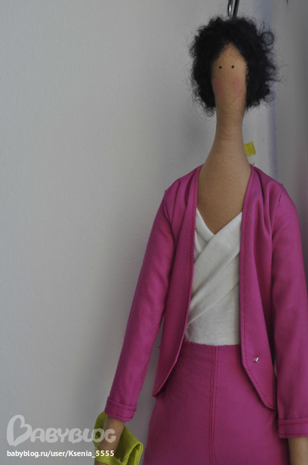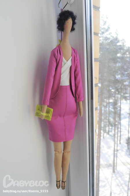 Очень стильный образ! Интересная идея создавать образы, основываясь на реальные персонажи. Думаю, если куколка будет стоять, коленочки можно было бы и не прошивать. Это мое мнение.