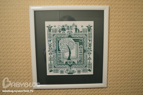 На самом деле цвет у вышивки изумрудный и очень яркий, но фотками сами молодджены. На вышивке есть дата их свадьбы, первые буквы их имен - Н и Н: Надежда и Николай. Им понравилось:))) кстати, оформляли они тоже сами в багетке,