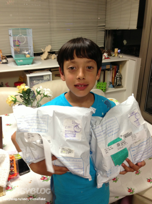 Подарочки приносили пока мы были с Та в бассейне, позвонила я на почту и села ждать (у нас домой приносят). Принесли их вечером около семи, а мне как раз надо собаку гулят, а Лукас настаивает открывать, ну уот не люблю быстро окрыват и разбирать, но пришлос открыват, да еще и Та все время за ноги хватался, поэтому фото все вразброс, вернее подарочки все кучей.