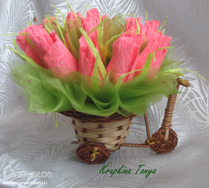 Татьяна, милый велосипедик. может только добавить какой-нибудь цвет еще? Наример, фунтики сделать темнее? Тогда светло-зеленые чашелистики ( блин, не помню, как они точно называются) будут выгодно подчеркныты.
