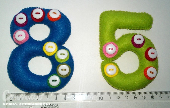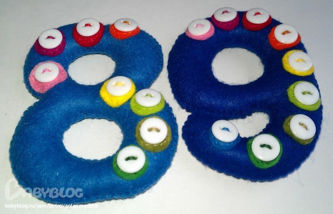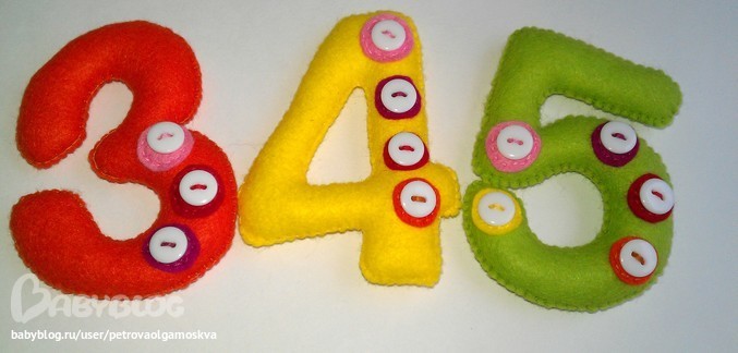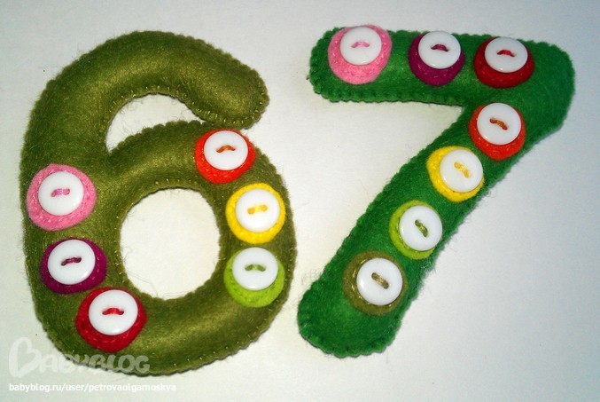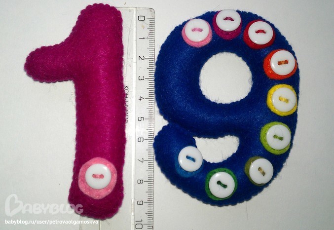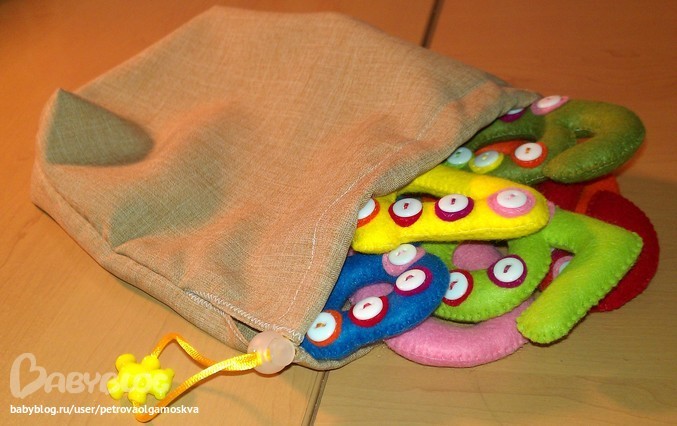 Цифры довольно крупные, пуговицы пришиты крепко, мешочек поможет не растерять цифры по квартире, десятку сделала нейтрального цвета - она уже для "продвинутых пользователей")))))) Цена 700 руб.