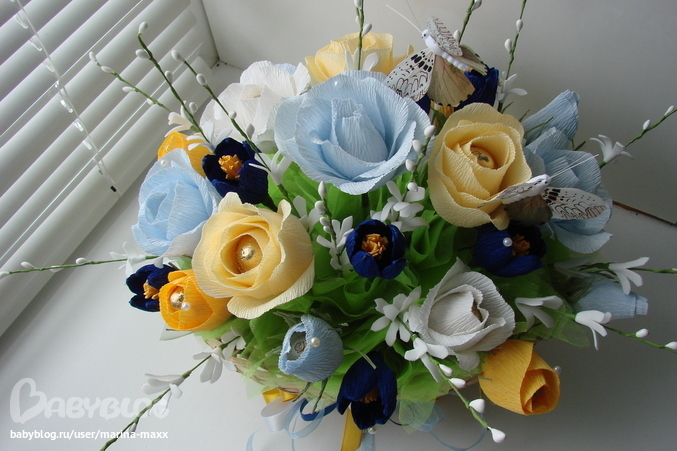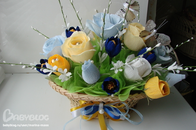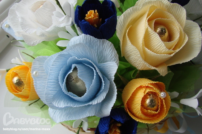 Синие цветочки без конфеток, наверное лаванда))). Попробовала в одной корзиночке собрать различные формы розочек. Что скажете?
