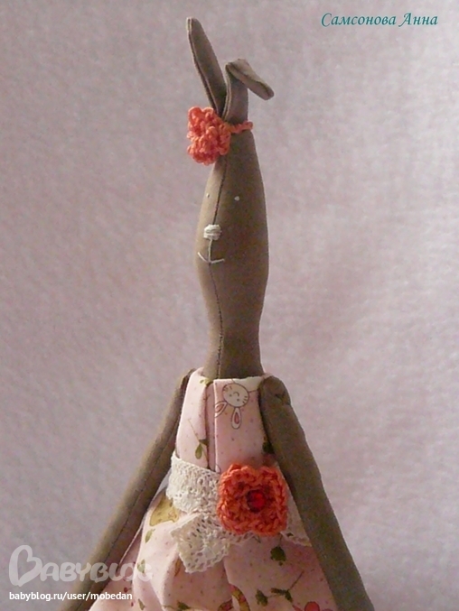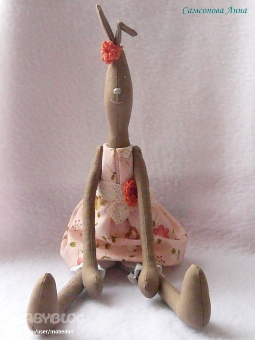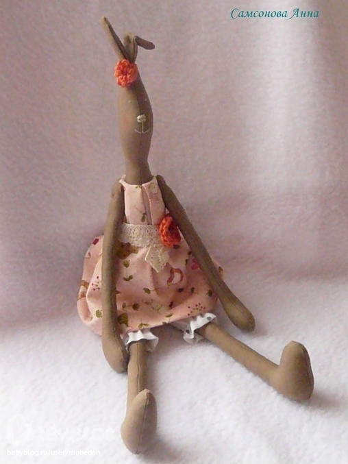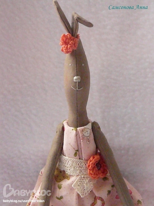 Зайка, платье и штанишки сшиты из хлопка. Платье украшено кружевом (хлопок), цветком вязаным крючком и стразом сваровски. Ушки повязаны лентой и цветочком вязаными крючком.