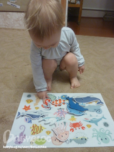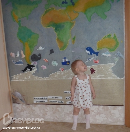 На следующий раз нужно было сделать наоборот- принести с ковролинографа указанную на листе фетра рыбку. Тут Танюшка начала путаться. Еще не очень хорошо владея знанием рыб и не видя её перед глазами, пока доходила до карты-ковролинографа видать забывала, что именно нужно, возвращалась, смотрела снова. Но с каждым разом получалась всё лучше.