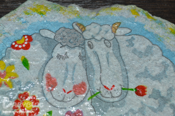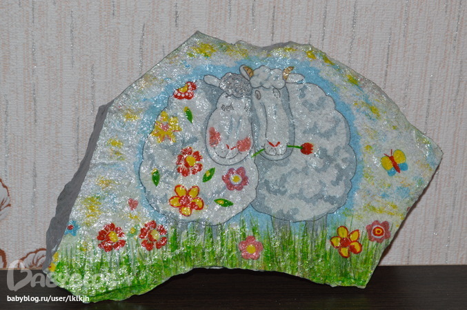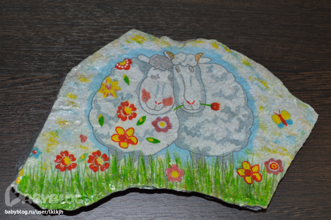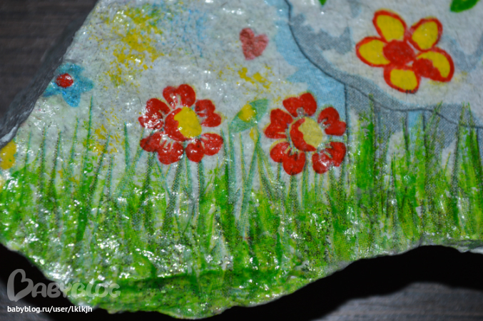 Не видели? Она в серванте стоит. Летом как-то в огород ставили. У меня еще где-то камешек был маленький весь покрытый салфеткой и лаком. Тоже интересно. Потом выложу.
