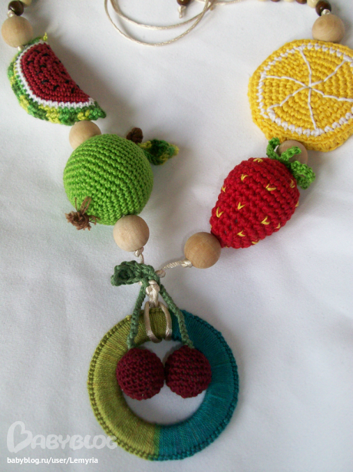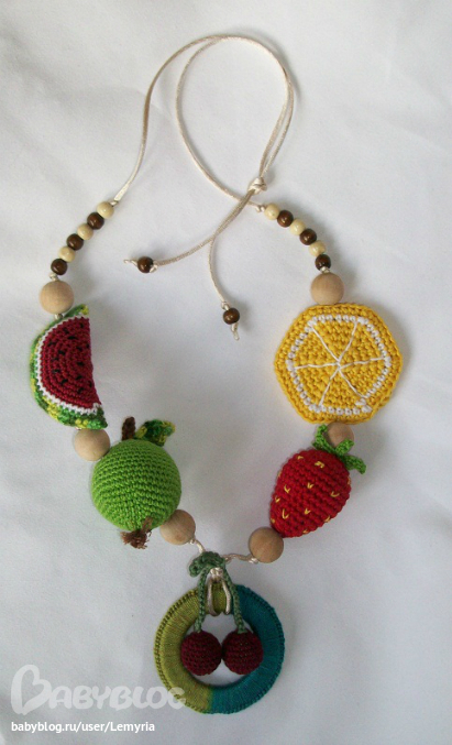 Слингобусы для малышей и мам. Развивающая игрушка для детей с рождения! Яркие цвета, разные на ощупь поверхности - ребёнок может их брать в рот (пробовать на зубок) - они абсолютно безопасны - изготовлены из можжевеловых и яблоневых бусин, вощёного шнура и обвязаны 100% хлопковой нитью. Яблочко - погремушка, арбуз мягкая шуршалка, лимончик щёлкает. Можно стирать в тёплой воде с мылом - быстро сохнут, не деформируются! Легко регулировать длину бус - для Вашего удобства. Можно использовать как растяжку над кроваткой или подвеску для коляски.