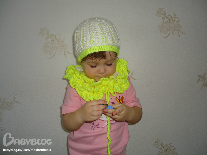 3. комплект, шапочка двойная, нижняя ССН, верхняя ажур, пряжа вита сапфир, желтая детская какая-то