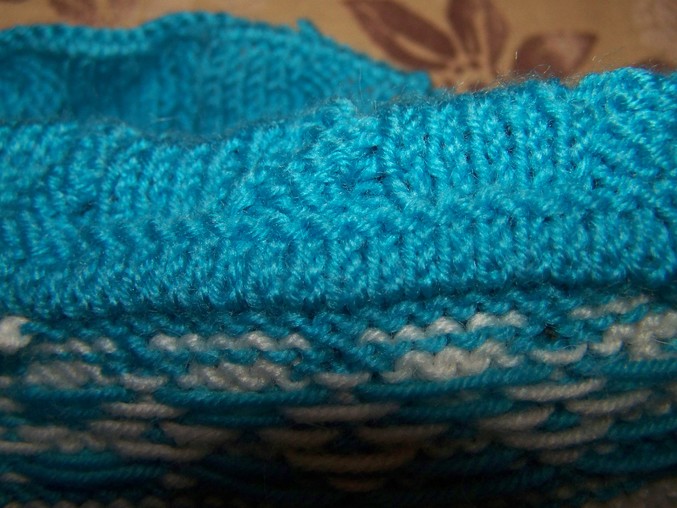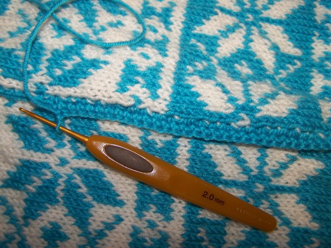 Вязала 2 ряда столбиками без накида бирюзовой нитью, 1 ряд столбиками с накидом белой нитью, 1 ряд столбиками без накида и 1 ряд "рачьим шагом" бирюзовой нитью.