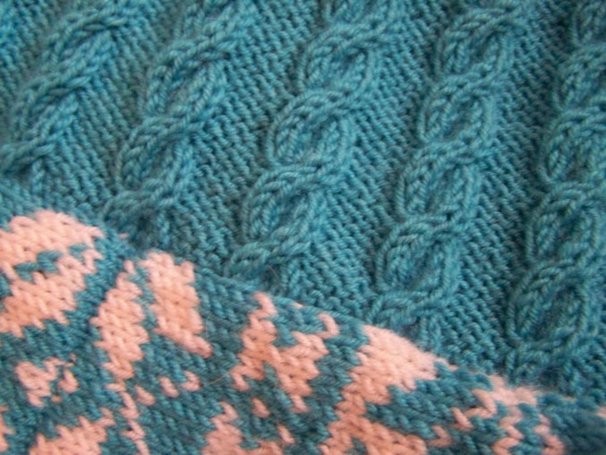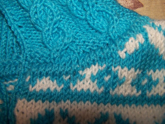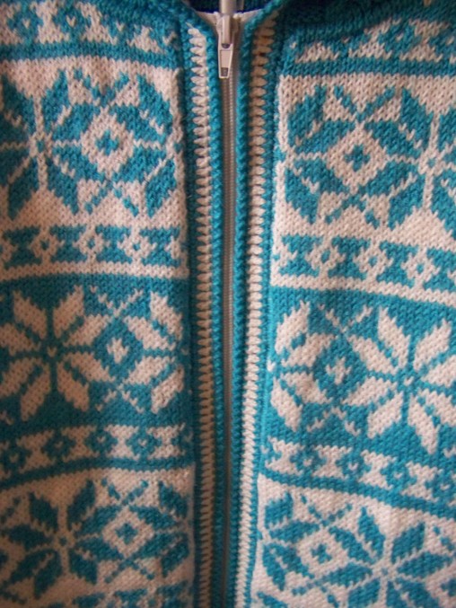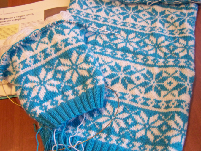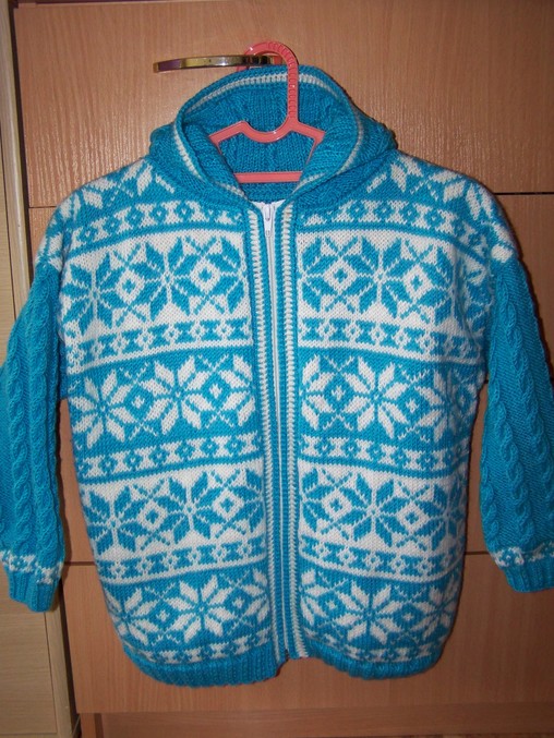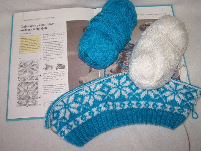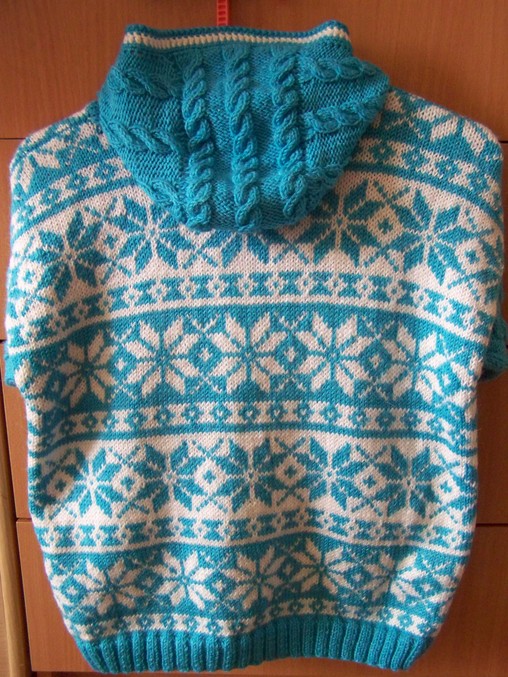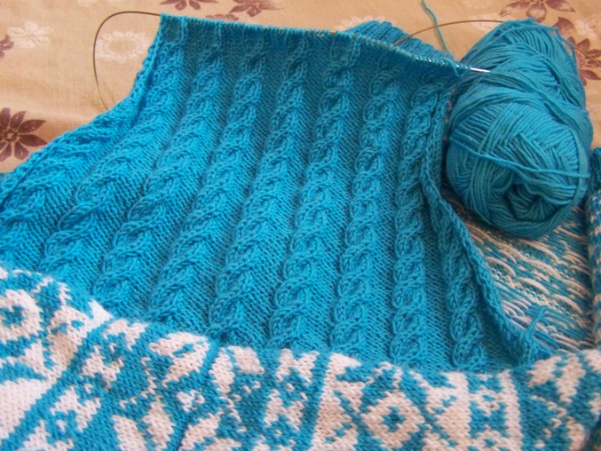 Набирала 110 п.нитью бирюзового цвета. Резинка 2х2 12 рядов. затем по схеме жакард. На высоте 47,5 см. начала вывязывать горловину. Закрыла средние 19 п.,затем в каждом 2-м ряду закрывала с обеих сторон по 6-3-2-1 п.