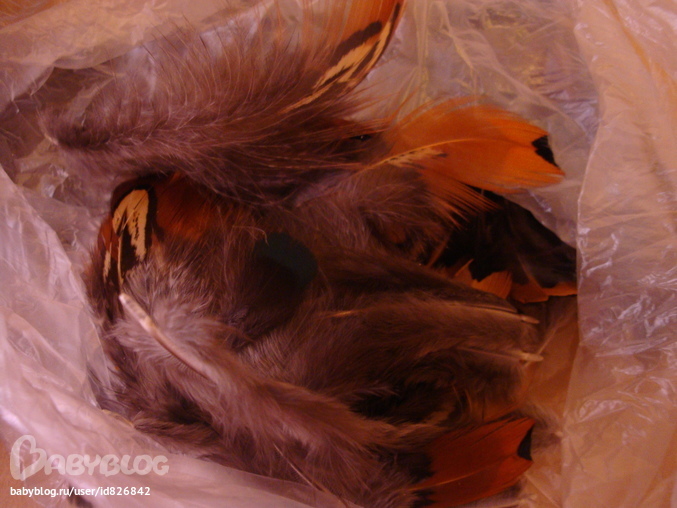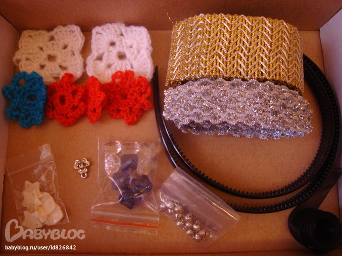 Описание:6 цветочков вязаных крючком, 2 тесьмы - золотистая (примерно 2 метра) и серебристая (около метра), 2 черных обруча-основы, пакетик перломутровых плоских бусин, пакетик пластмасовых бусин - белых и синих, маленькая подвесочка-цветочек с камушками, тесьма черная прозрачная (около метра), пакетик соединительных бусин металлических, пакет настоящих перьев фазана