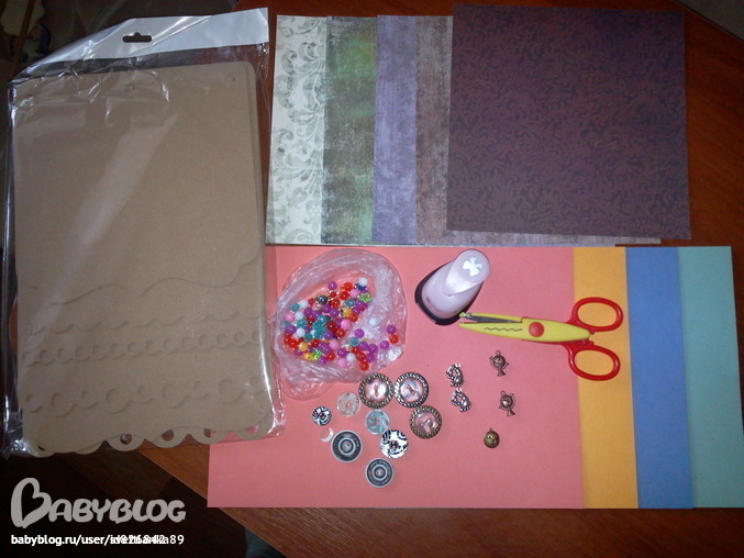 Описание: заготовка для альбома ажур с кружочками 20*20.5(6 листов+кольца), 5 листов односторонней скрап бумаги, 4 двухсторонних листа картона для пастели, дырокол "бантик", Фигурные ножницы, пуговички, подвески глобус и детские ножки, бусины.