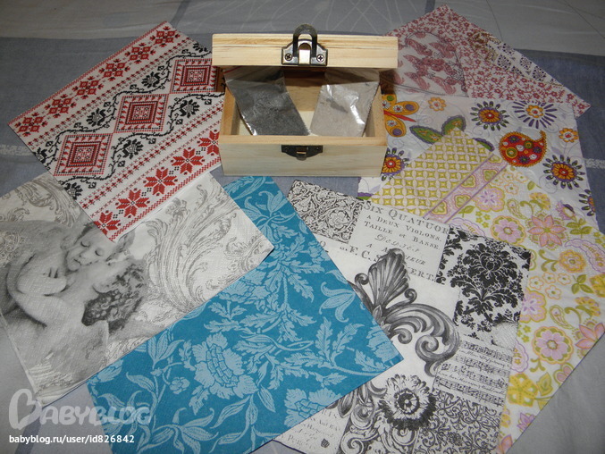 Описание:заготовка для декупажа "шкатулка"(11смх7смх5,5см),салфетки для декупажа-7шт,перламутровая пудра-2шт.(белая и серая-графит)