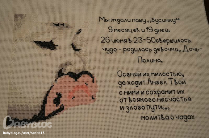 )))) надпись придумывала (кроме молитвы конечно) не обидели))))) про бледность лица я думала в процессе вышивания, все время сравнивала нитки, но когда вышила, вроде ничего показалось, да и муж убедил что все в порядке и бледно не смотрится. А с цветом надписи....... ну даже и не знаю, мне кажется лучше черным оставить, чем какой-то другой цвет искать. Спасибо в любом случае)))