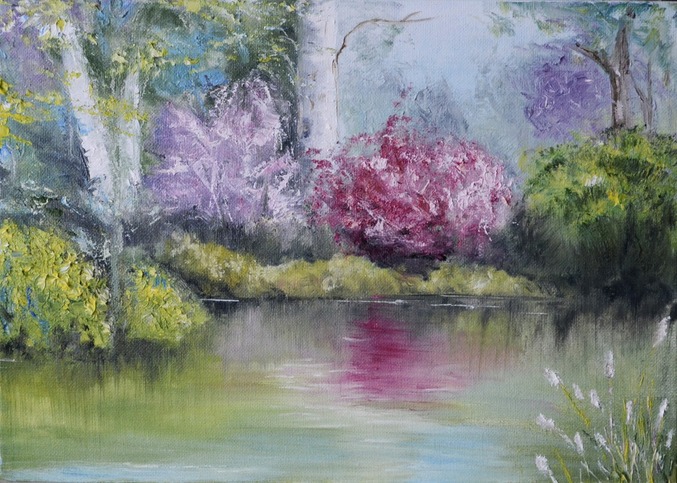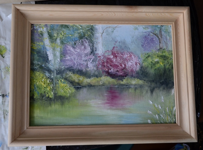Мне кажется, сюда нужна белая рамочка, но потоньше, чем эта. Вот белые деревья и сиреневый куст как-то немного смущают своей текстурой и направленностью штрихов.. :)