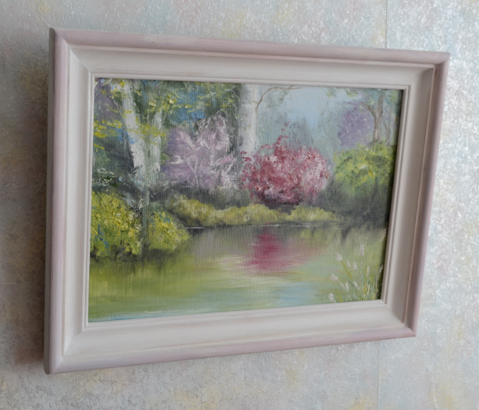 По мне все отлично, пятна на березках не нужны, картина потеряет свою нежность. Рамочку можно покрасить в лиловый, сиреневый цвет (ну это на мой взгляд, хотя у самой с этим не очень). Приятная работа.