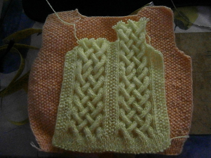 Ну вот теперь и вяжите. Должно получиться. в следующий раз знайте, что "путанка" или "рис", которыми связана спинка, немного расширяет даже ширину, а "плетёнка" наоборот сжимает и очень сильно!