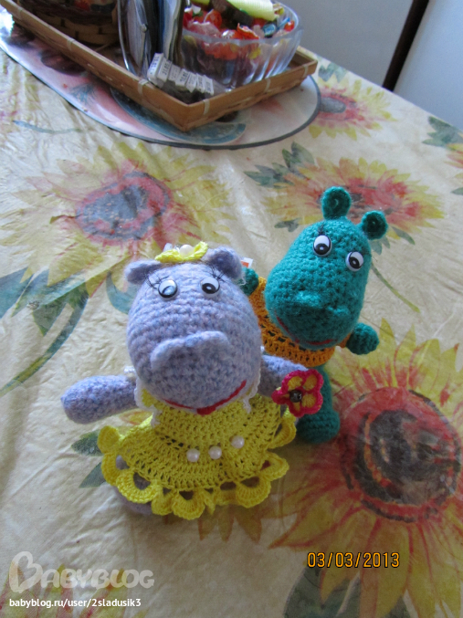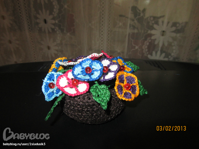Очень давно хотела научиться вязать крючком, меня очень привлекали яркие, роскошные, кружевные изделия, как живые цветы и особо милые игрушки.И вот что получилось.....не судите строго)))))))))