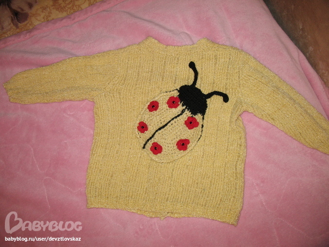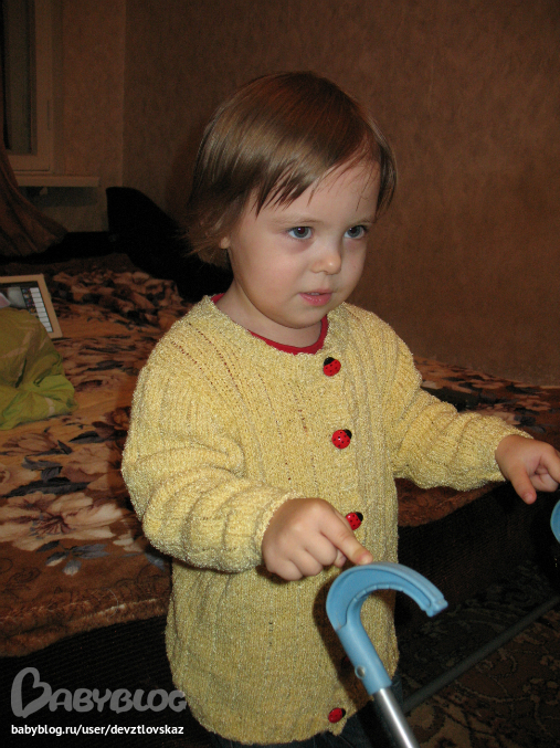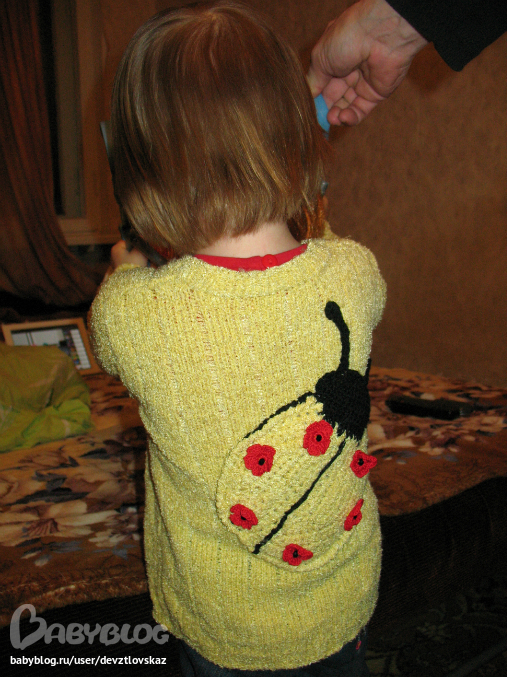 Ваша бабушка молодец!! Не загрузила перед большой аппликацией, а украсила милыми пуговичками. Кофточка получилась под стать модели, очень стильная!!!