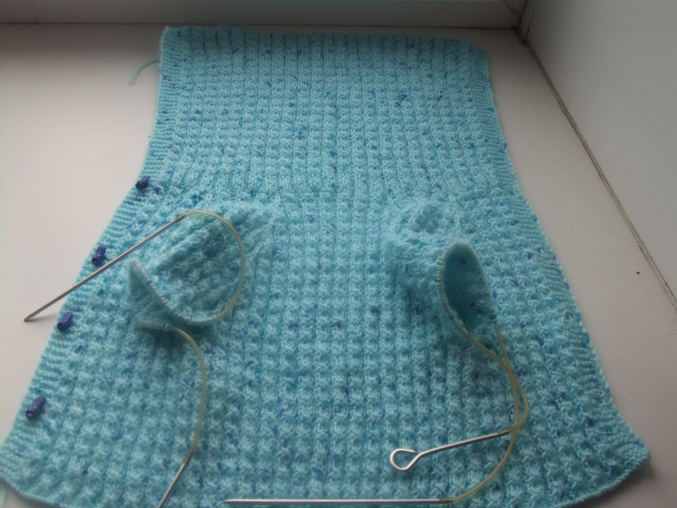 Для кофточки с капюшоном взяла 2 мотка пряжи Alize Mini Color. Набираем 125 петель. Резинки нет- поэтому с первого ряда нужно разделить петли по рисунку. В моём случае с каждой стороны вязания по 5 петель изнаночными петлями для планок.Раппорт рисунка- 5 петель ( изнаночная*3 лицевых*изнаночная ). В изнаночных рядах петли вяжутся по рисунку. Второй ряд- изнаночная* из 3 лицевых петель 3 петли (накид-лицевая-накид). Я вяжу от макушки капюшона. чтобы потом перейти на реглан сверху.