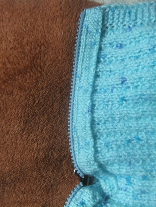 Довязываем рукава. Вшиваем в капюшон молнию. Чтобы не было видно как мы вшили молнию- прячем под обтачку.