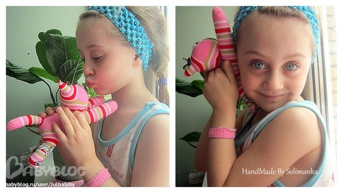 Долго думала, что ж за игрушки можно сделать совместно? Хотела лощадь на палочке- скакалку..Но времени на нее уйдет куча, да и дочка участия огромное не примет. Покопавшись в своих закромах, нашла милых игрушек из носков. Написано конечно из бу носков