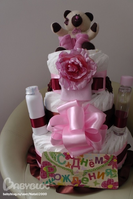 В этом тортике мишка, цветок-заколка и розочки в качестве украшений сделаны моими стараниями)) А еще там носочки, присыпка, маслице,повязка, погремушка и конвертик с денюжкой)))) ааааа, ну и памперсы, конечно)))